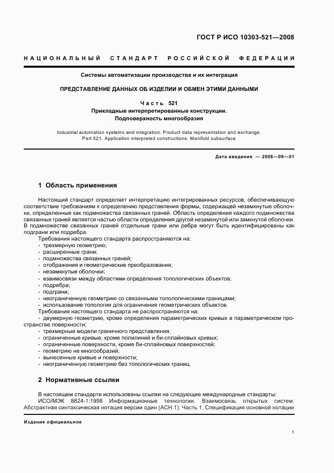 - Настоящий стандарт определяет интерпретацию интегрированных ресурсов, обеспечивающую соответствие требованиям к определению представления формы, содержащей незамкнутые оболочки, определенные как подмножества связанных граней. Требования настоящего стандарта распространяются на: - трехмерную геометрию; - расширенные грани; - подмножества связанных граней; - отображения и геометрические преобразования; - незамкнутые оболочки; - взаимосвязи между областями определения топологических объектов; - подребра; - подграни; - неограниченную геометрию со связанными топологическими границами; - использование топологии для ограничения геометрических объектов. Требования настоящего стандарта не распространяются на: - двухмерную геометрию, кроме определения параметрических кривых в параметрическом пространстве поверхности; - трехмерные модели граничного представления; - ограниченные кривые, кроме полилиний и би-сплайновых кривых; - ограниченные поверхности, кроме би-сплайновых поверхностей; - геометрию не многообразий; - вынесенные кривые и поверхности; - неограниченную геометрию без топологических границ